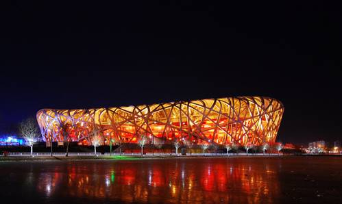 鸟巢,即国家体育场,是2008年北京奥运会的主场馆,由于于独特造型又俗称“鸟巢”。体育场在奥运会期间设有10万个座位,承办该届奥运会的开、闭幕式,以及田径同足球等比赛项目。由2001年普利茨克奖获得者赫尔佐格、德梅隆与中国建筑师李兴刚等合作完成的巨型体育场设计,形态如同孕育生命的“巢”,它更像一个摇篮,寄托着人类对未来的希望。设计者们对这个国家体育场没有做任何多余的处理,只是坦率地把结构暴露在外,因而自然形成了建筑的外观。2003年12月24日开工建设,2008年3月完工。2014年4月中国当代十大建筑评审委员会从中国1000多座地标建筑中,综合年代、规模、艺术性和影响力四项指标,初评出二十个建筑。最终由此产生十大当代建筑。北京鸟巢——国家体育场为初评入围建筑之一。里约奥运会即将开幕,北京奥运会的标志性场馆——国家体育场“鸟巢”在4日晚以亮灯的方式为里约奥运会送去祝福。